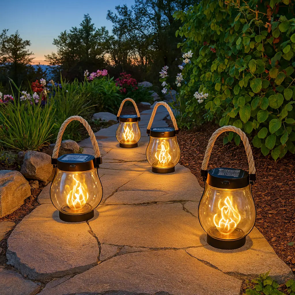 Solar-powered flame lanterns made to last all night, rain or shine